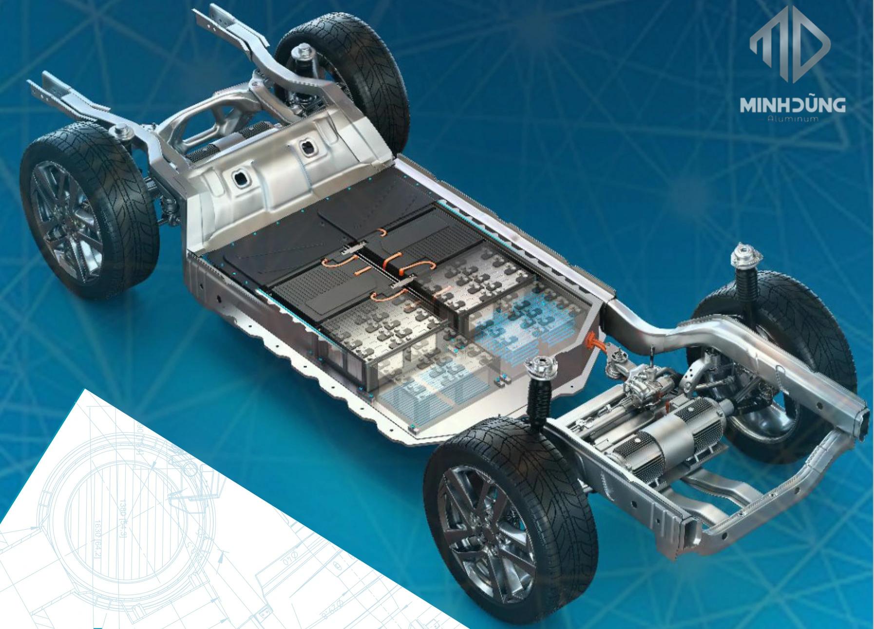 - Tấm sàn tích hợp pin (structural battery pack), nơi pin trở thành bộ phận chịu lực; nhôm giúp phân tán tải trọng, giảm xoắn sàn và tăng độ an toàn.